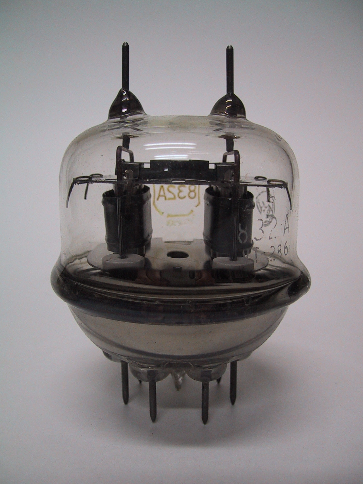 the glass envelope of a tube, clouds of electrons are launched by orange-hot
